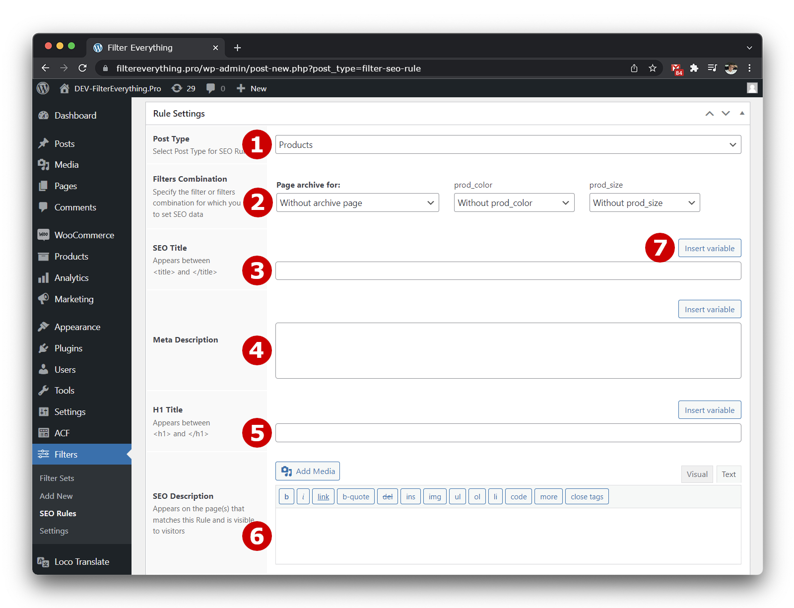 7. Insert variable – variables will be replaced with specific values on the page that match the current SEO Rule. For example, on the page with URL path /color-blue/size-large/ variables {color} and {size} will be replaced with words “blue” and “large”