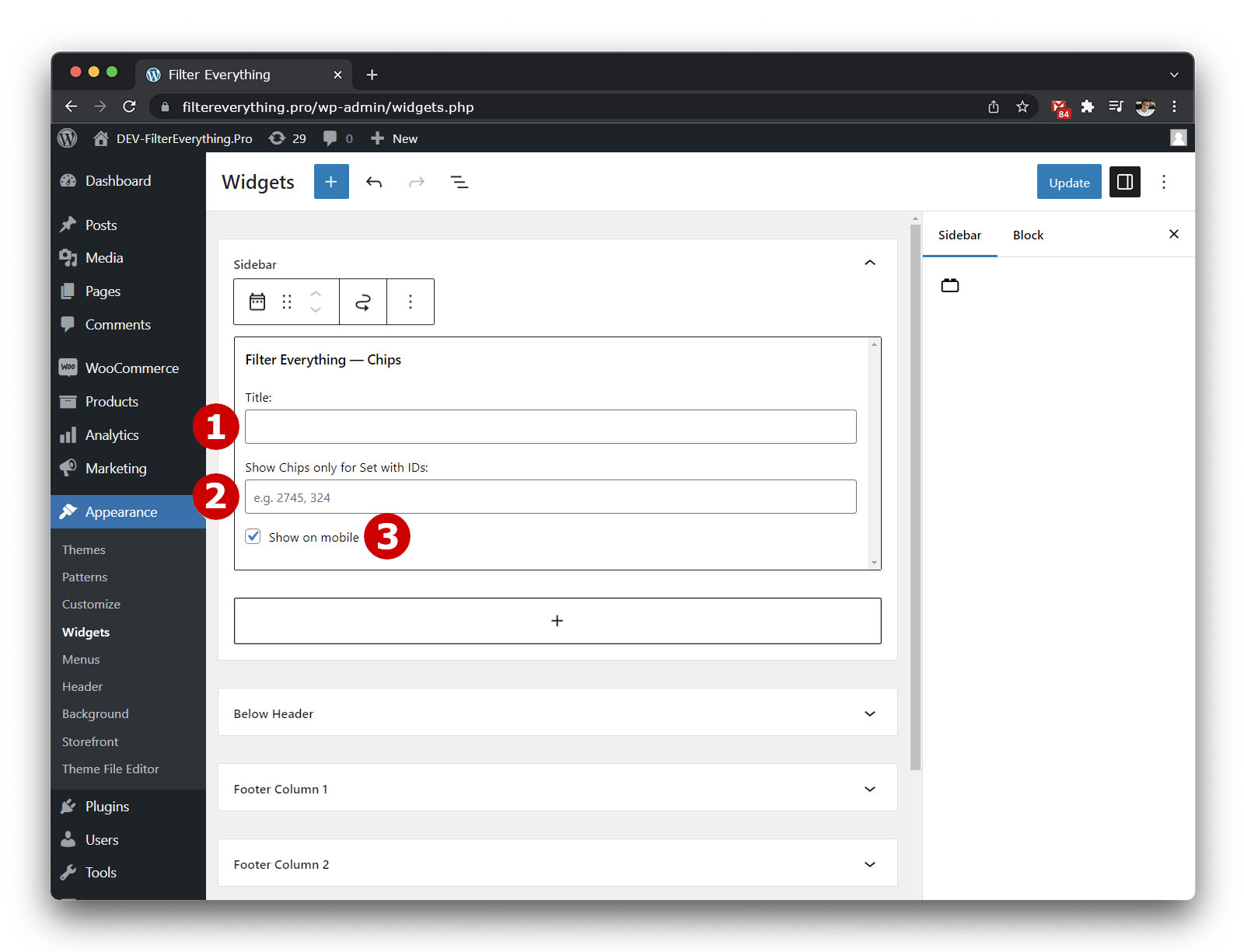 Title– a title that usually not requiredShow Chips only for Set with IDs– allows you to specify those Filter Sets for which you want to show chips. In most cases, it does not need to be filled in and the widget will automatically display all the selected terms of all filter sets that are on the page.
