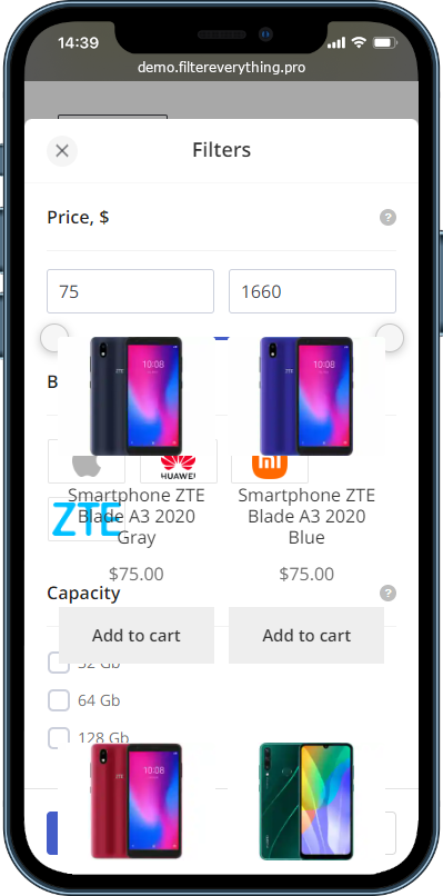 In mobile mode, you can use different ways to display the filters widget. It can be the same as on the desktop, collapse/expand functionality, or a special pop-up widget.