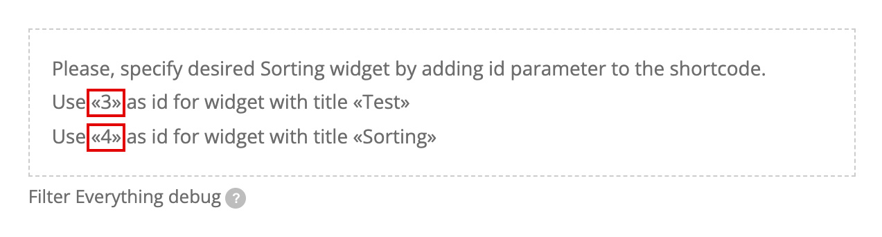 To find desired widget ID, you can insert the shortcode without id parameter, just [fe_sort] and to check the place, where it will be shown. You will see debug message, that shows you available Sorting Widget ID(s). For example “3” or “4” in our case.