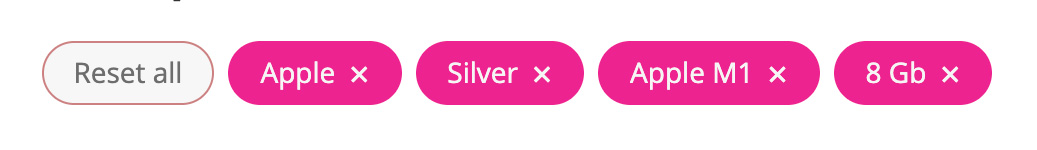 id– ID of the Filter Set whose selected terms you want to display. Optional parameter. If not specified, all selected terms of all Filter Widgets on the page will be displayed by default. Of course, the specified term must correspond to the Filter Set, which is located for this page.mobile– determines whether to display chips on mobile devices. By default, chips are hidden on mobile devices.reset– allows you to turn off the “Reset all” button and not display it. The button is displayed by default.