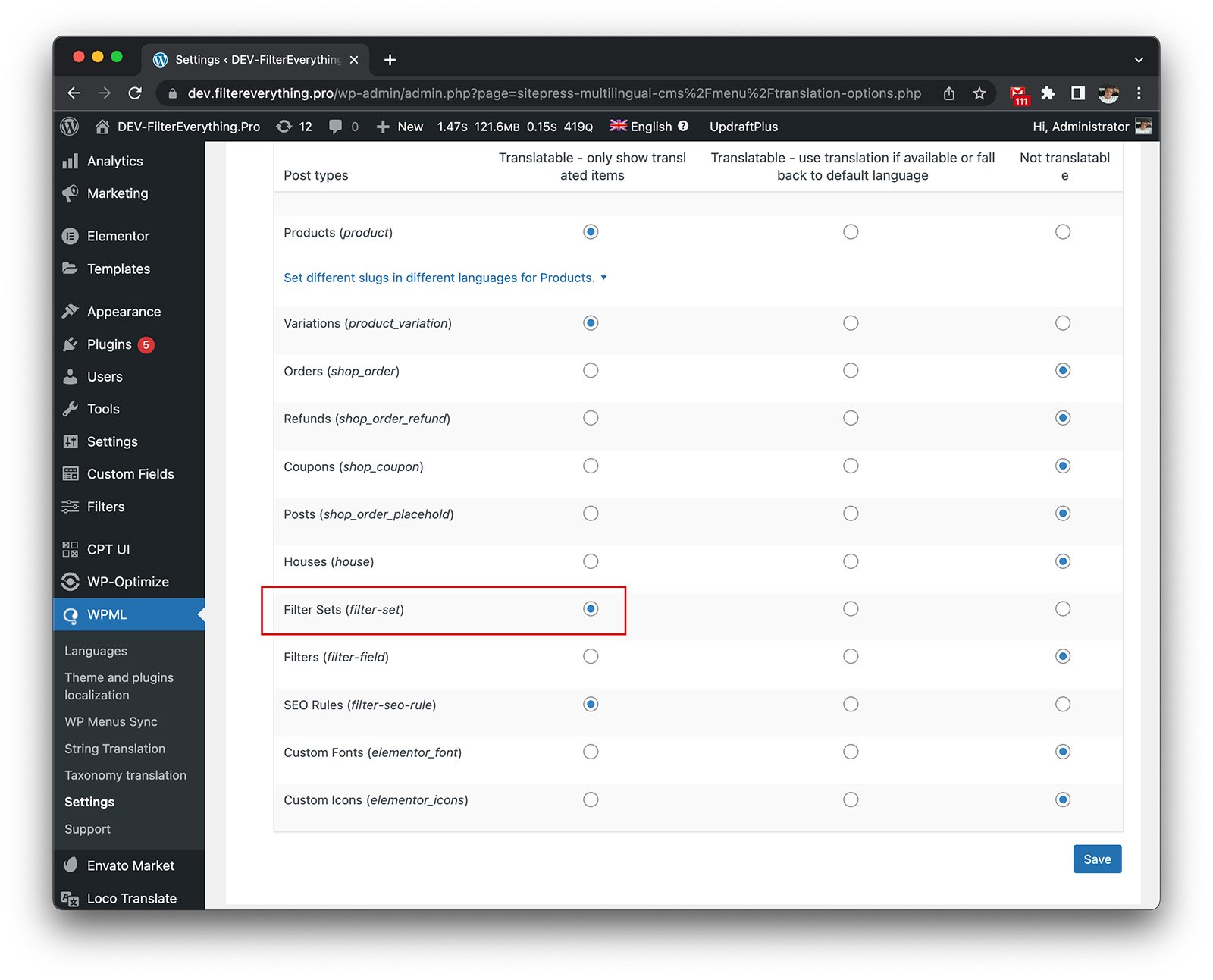 The Filter Everything PRO and Free plugins are compatible with WPML and allow you to create translations of Filter Sets to use according to the current language on a site. This is not necessary and you can use the same Filter Set for all languages on your site. But if you want to translate Filter Labels, then it is better to create translations. To do this, you need to make the Filter Set translatable Post type in the WPML settings -> Settings -> Post Type Translation as it is shown on the screenshot below